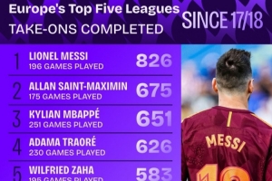 今日热点11月19日讯 Squawka统计自17-18赛季以来,五大联赛球员成功过人次数,梅西以826次居首,圣马克西曼、姆巴佩排在二三位。